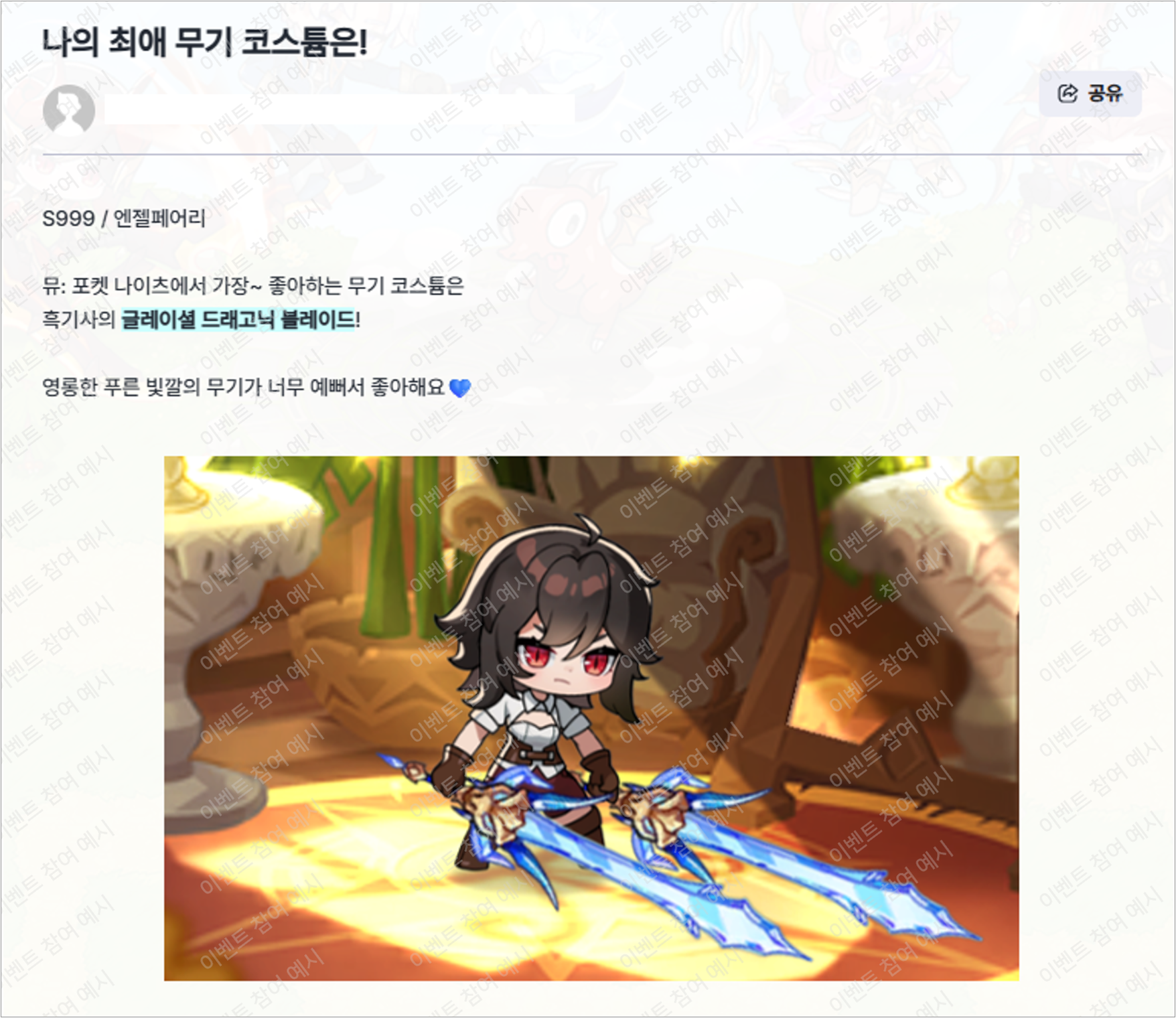 - 이벤트 기간 동안 최애 무기 코스튬의 이름과 스크린샷, 서버/게임 내 닉네임(캐릭터명)을 게시글로 등록하여