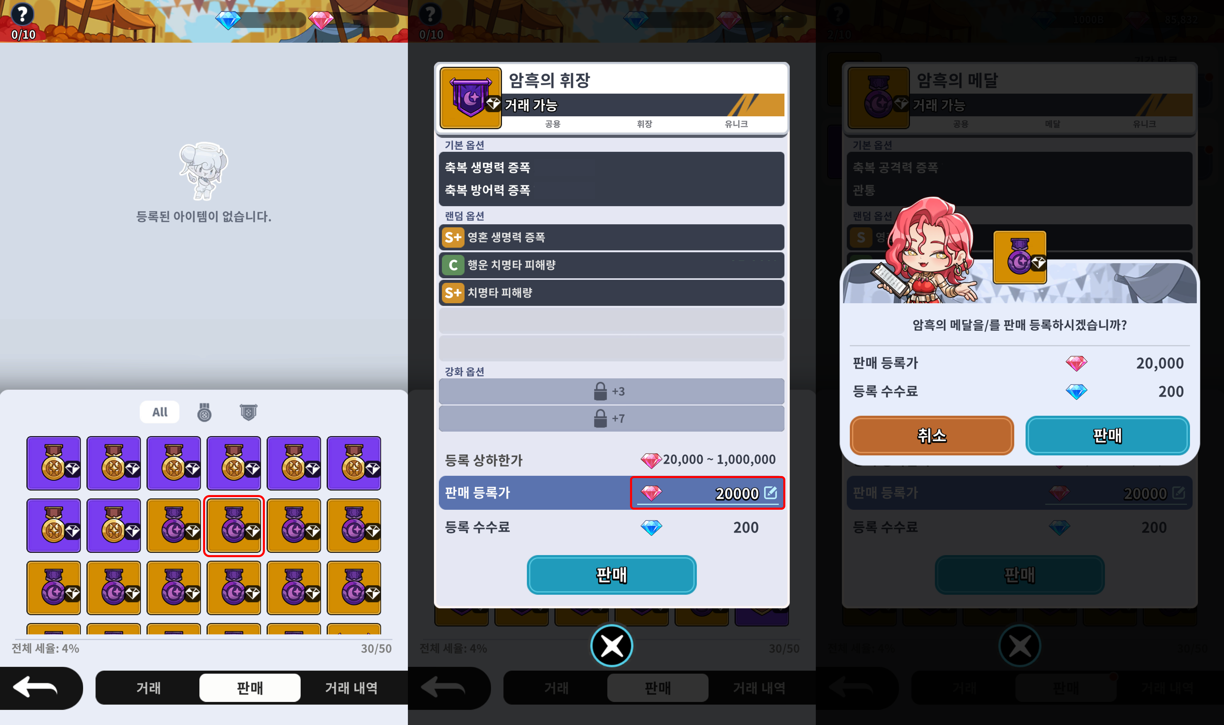 - [판매] 탭에서 '취소' 버튼을 누르면 거래소에 등록했던 아이템이 우편으로 반환됩니다.