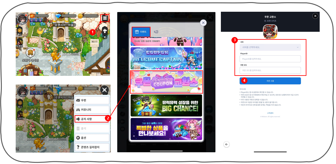 - - 쿠폰 사용 시 쿠폰 보상은 우편을 통해 지급되며, 명시된 유효기간 내에만 받으실 수 있습니다.