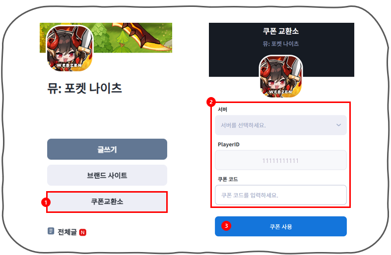 2. 서버 선택 → PlayerID 입력 → 쿠폰 코드 입력 후 [쿠폰 사용] 버튼 터치
