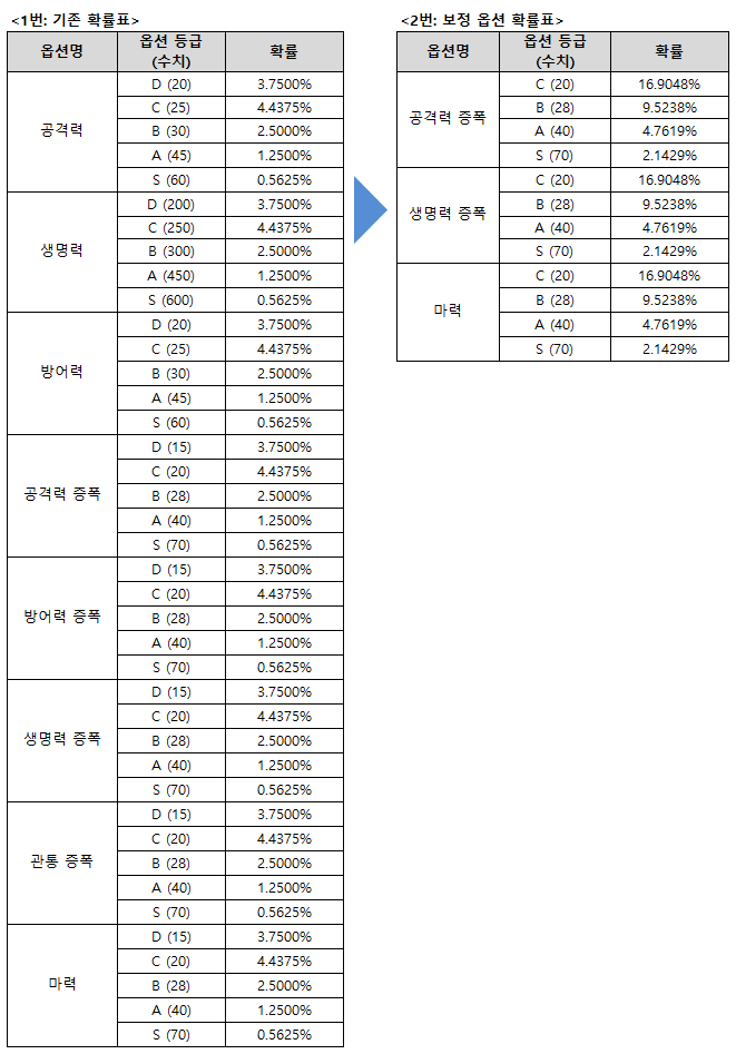 본래 초기 기획은 레어 등급의 무기 코스튬 옵션 재련 시 재련 횟수에 상관없이 <1번: 기존 확률표>가 적용되는 것이었습니다.