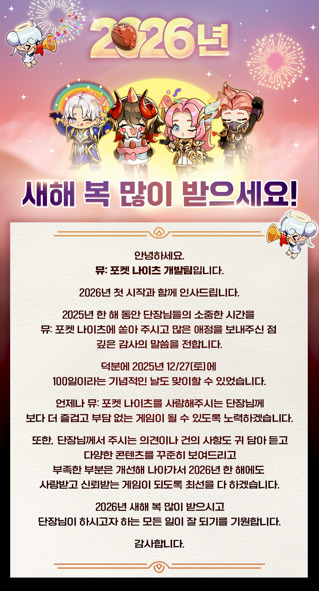뮤: 포켓 나이츠의 2025년 9월 18일 런칭이 엊그제 같은데 벌써 2026년이 되었어요!👏