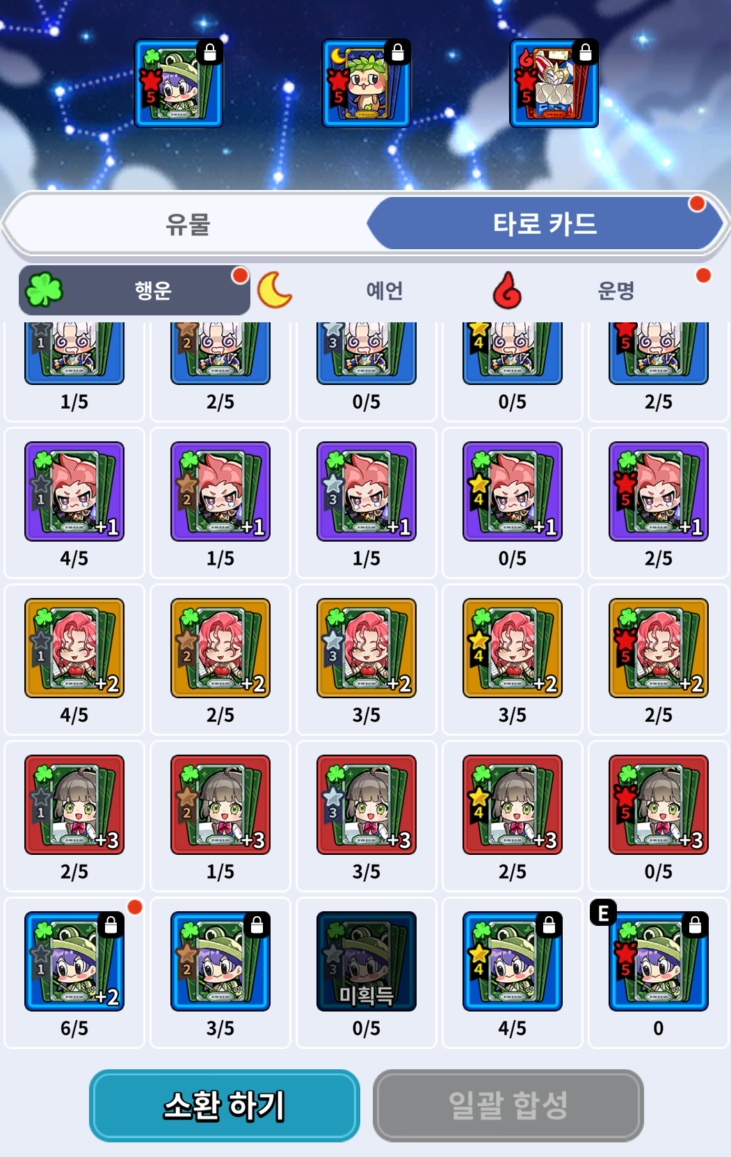 1.2강을 할때는 각 5장을 모으고하면 되지만 3강을 할때는 10장이 필요하여 잠그지않고 실수로 일괄합성을 할 경우 윗장으로 넘어가는 경우가 있습니다.
